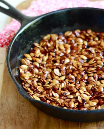 This recipe for roasted pumpkin seeds is made with honey, olive oil and salt. I love roasting them in a cast-iron skillet to bring out their natural nutty flavor. So easy! Ready in 30 minutes!