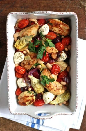 My famous Mediterranean baked chicken recipe is made with juicy, chicken thighs, white beans, caramelized onions, tomatoes, artichokes (and more). It’s super simple to make – everything’s baked in one pan. There is a reason why it’s one of the most popular recipes on my blog! It’s a crowd pleaser. Serves 4.