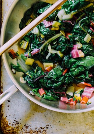 - Add the swiss chard, in one big pile, using tongs to toss and turn the leaves as you go. Place the lid on top and cook until tender, about 5-6 minutes. Check on it after a couple of minutes or so to see how it’s doing. Season with salt and pepper to taste.