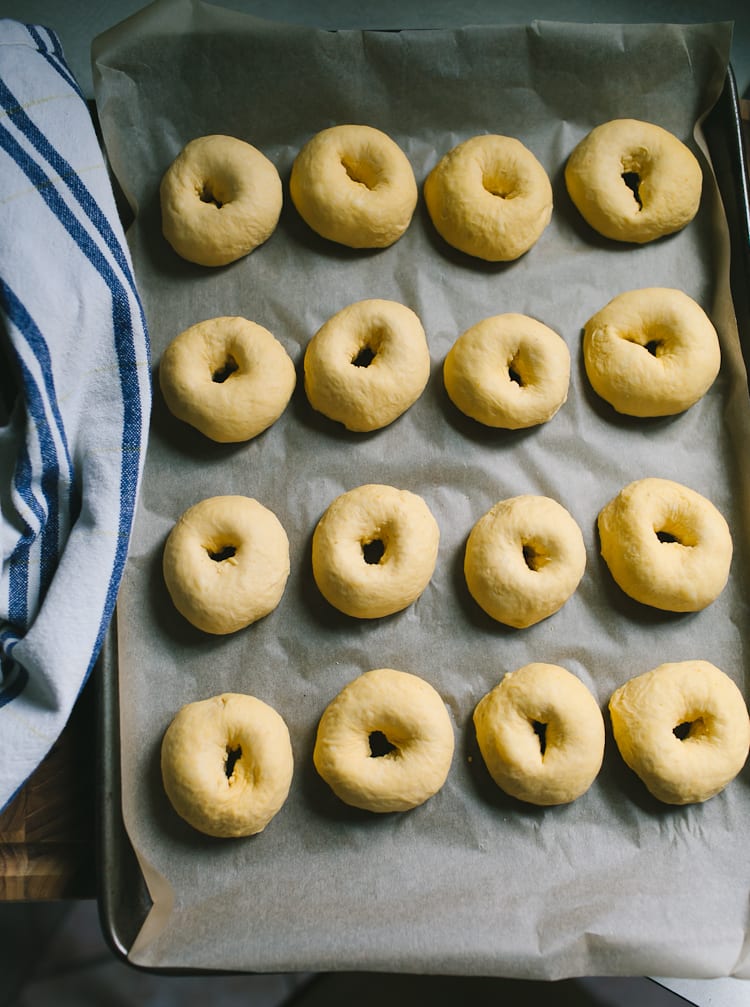 - To shape into bagels, poke your finger through the center of each dough ball. Lift up the dough and stretch the opening to about the size of a walnut. Place back onto your sheet pan. Repeat with the remaining dough. Cover with a damp towel and let rest for 15- 20 minutes.