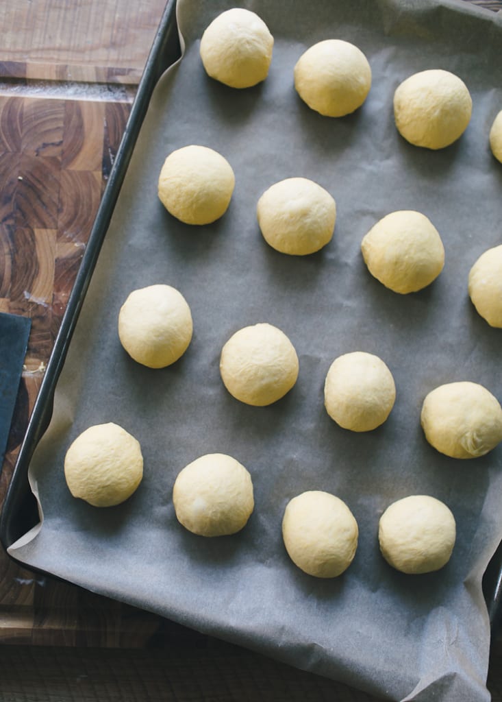 - Working with one dough at a time, gather the ends toward the center, flip it over, and then roll into a ball using the palm of your hand. Place onto a parchment lined sheet pan lightly coated with cooking spray. Repeat with the remaining pieces of dough. Let rest for 15 minutes to relax the gluten.