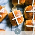 I didn’t grow up eating hot cross buns. But my friend Celia did, and every year she makes the most gorgeous, perfectly plump hot cross buns for her family and friends to share at Easter. Talk about baker’s envy! (fun fact: she taught me how to bake this sourdough bread recipe too).