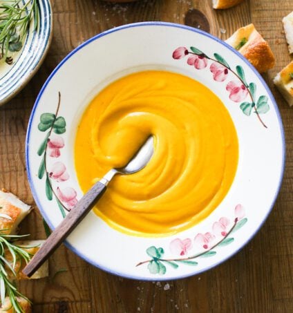 This easy, creamy, 30-minute butternut squash soup recipe comes together FAST with pre-roasted butternut squash which requires ZERO prep work {no peeling, chopping or deseeding}.