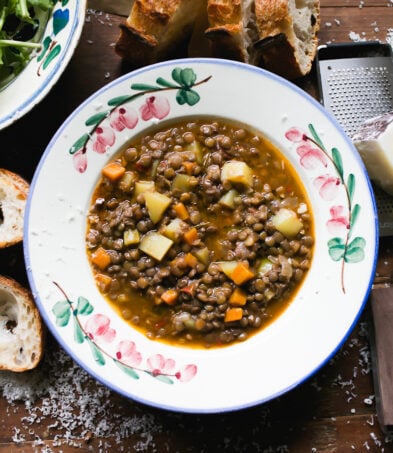 This Italian lentil soup comes together in 1 hour, thanks to fast cooking green lentils- no overnight soaking required. Fresh tomatoes brighten the thick and hearty broth, while a unique bundle of fresh herbs (rosemary, thyme, bay leaf and mint) elevates the flavor. Recipe adapted from Cucina Povera by, Giulia Scarpaleggia.