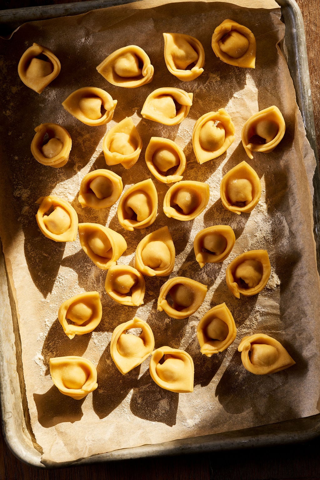 - Set shaped tortellini on a parchment-lined sheet pan dusted with semolina flour and keep covered at all times. They will dry out. if you don’t have a sheet pan w/ lid, use an inverted sheet pan to cover the tortellini. Repeat to roll, cut and shape the rest of the tortellini. See Note 6.